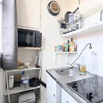 Beau Studio Confortableは必要な家電製品がすべて揃った台所があります。 アパートはマルクス・ドルモワ地下鉄駅から徒歩で約5分で、パリ北鉄道駅から徒歩で約15分ほどの場所にあります。